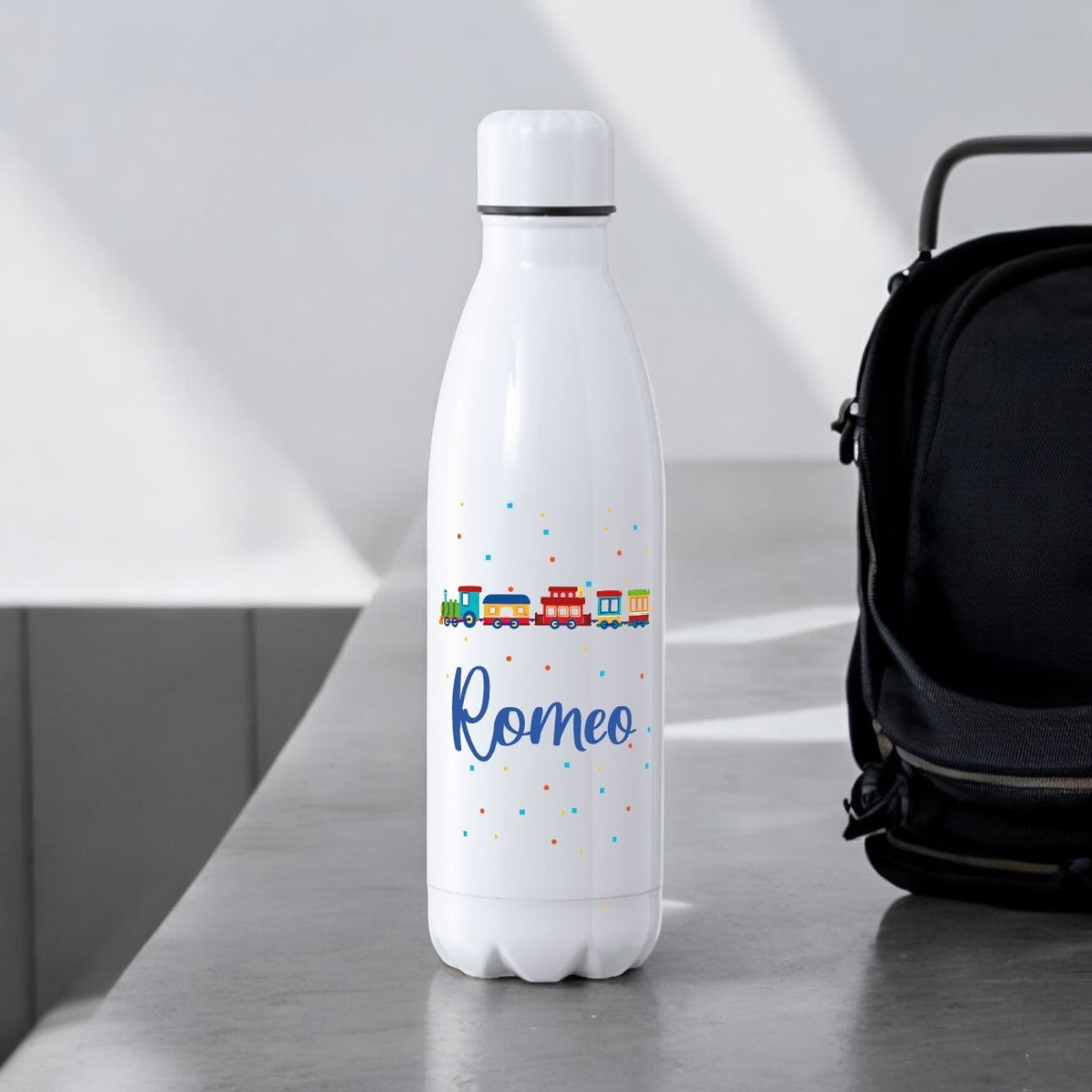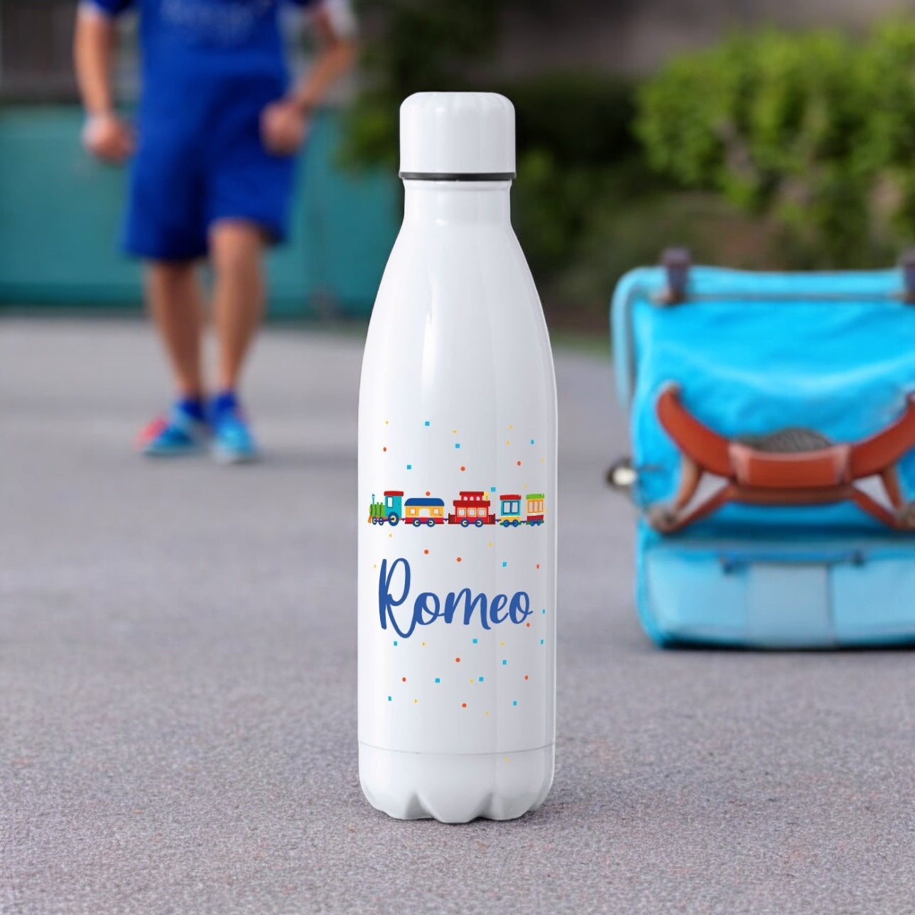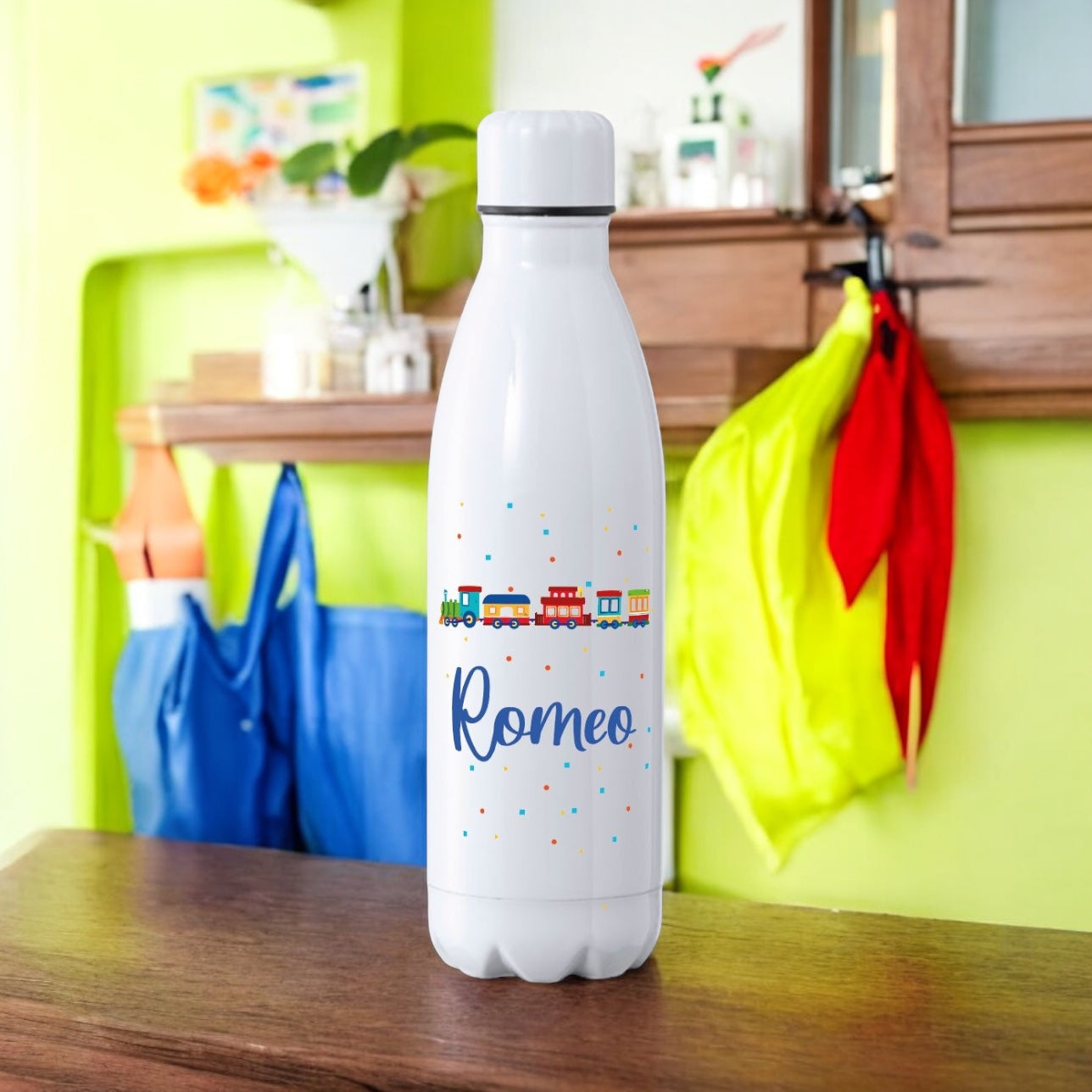 La nostra borraccia termica in acciaio inox personalizzata con nome e simpatici disegni, mantiene la temperatura delle bevande fredda e calda