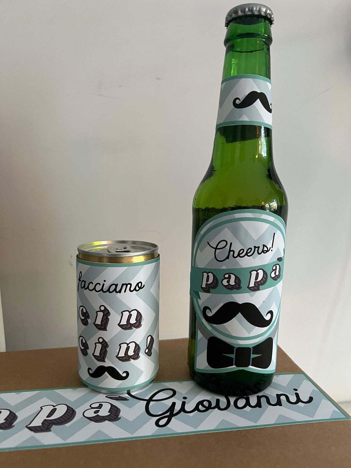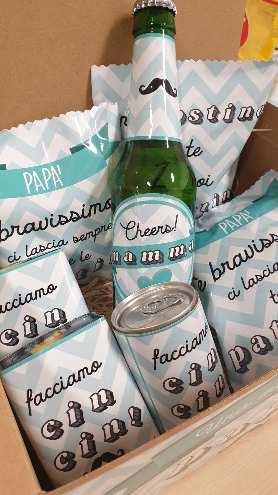 BOX 1: La box merenda con il papà per un bambino, comprende due pacchetti di patatine, un pacchetto di noccioline, una birra e una mini coca cola.