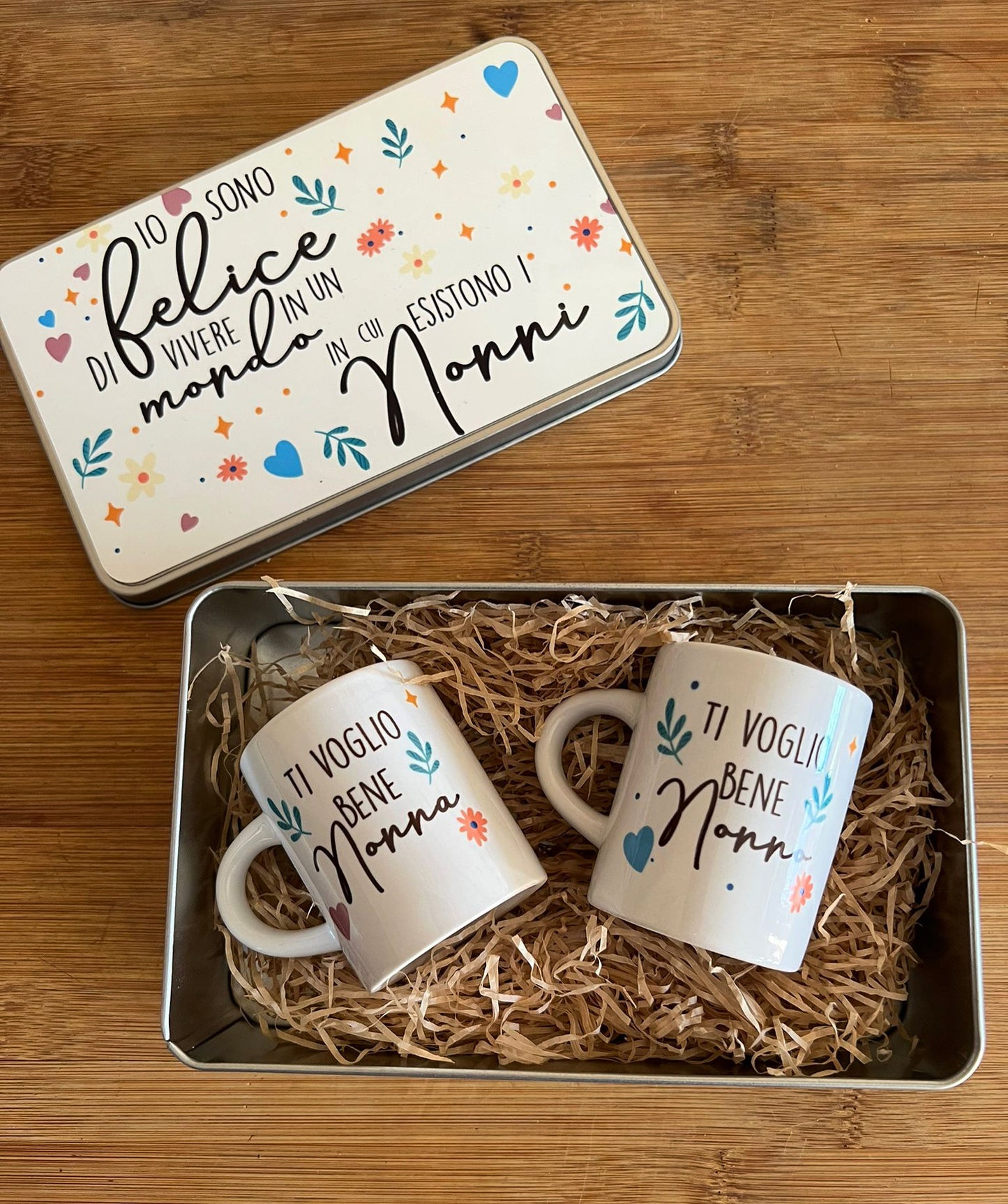 Set con Tazzine caffè in Ceramica per Nonni e scatola in alluminio