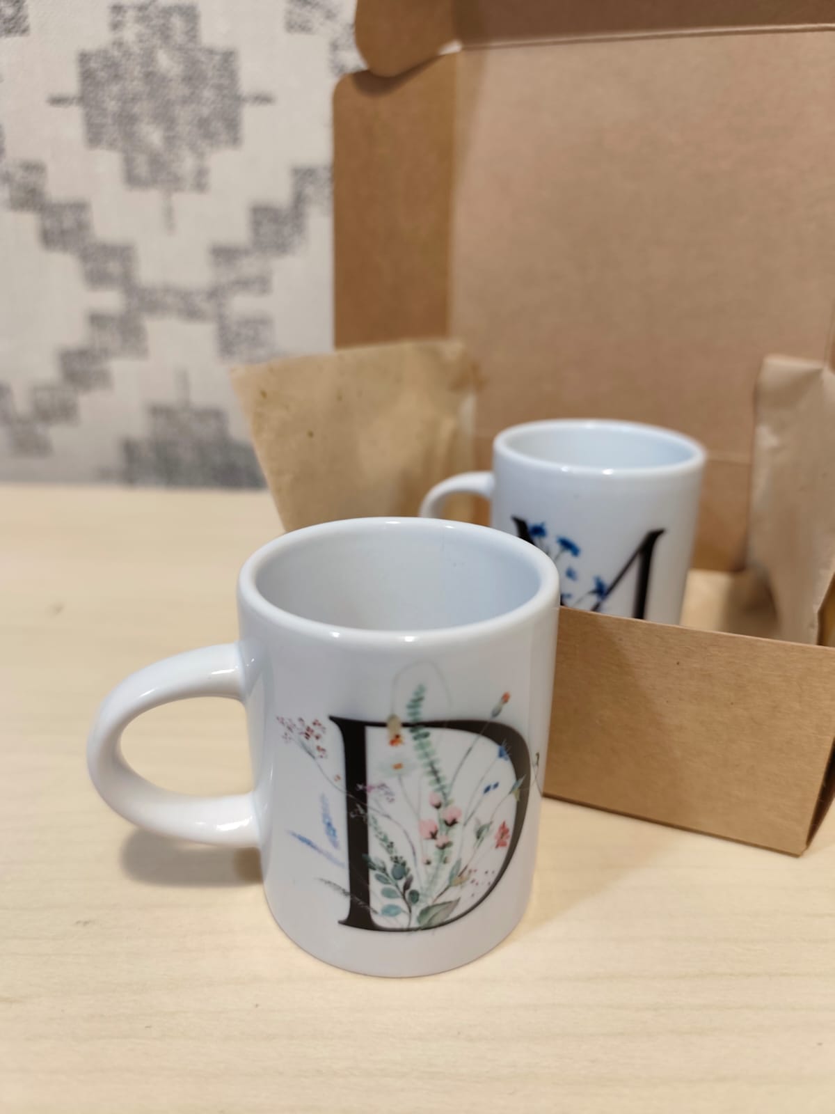 Box contenente 2 tazzine da caffè in ceramica bianca personalizzate con iniziali.