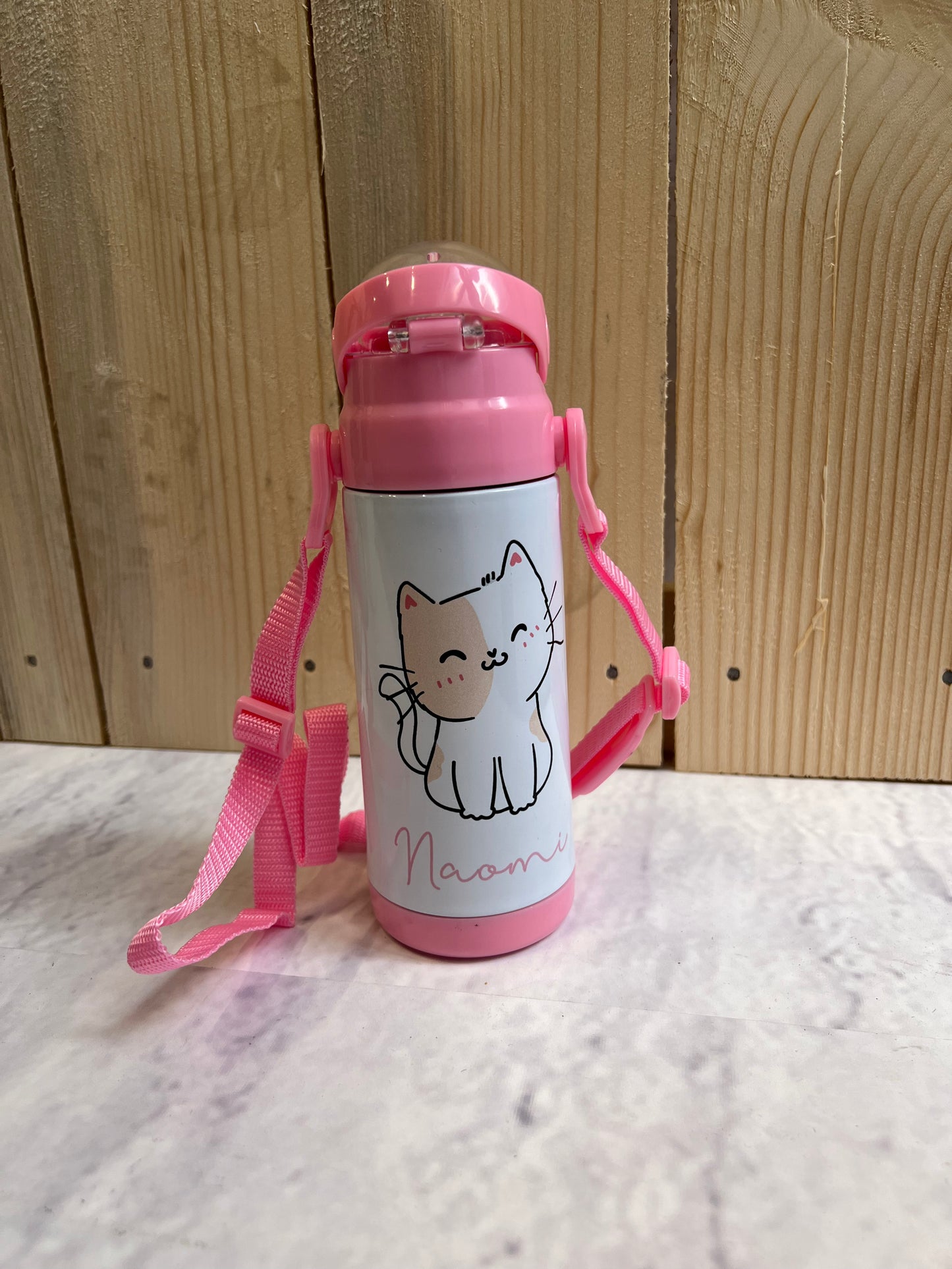 Borraccia termica per bambini con tappo a beccuccio e tracolla colorata.
